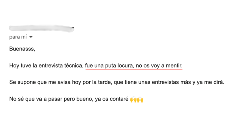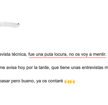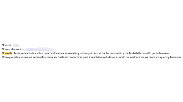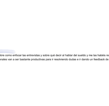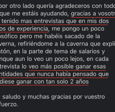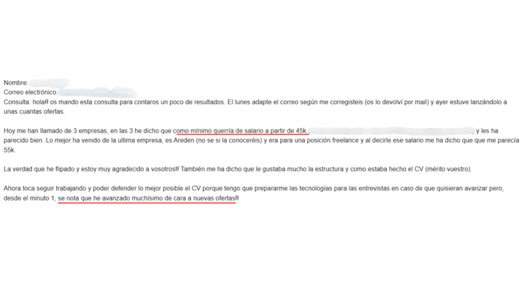 "Antes de empezar con vosotros no conseguía pasar las entrevistas. Ni me respondían. Ahora, en menos de 1 mes he conseguido 5 entrevistas. 2 de ellas me hicieron una oferta en firme y acepté una que aumentó mi anterior sueldo en 17.000€."